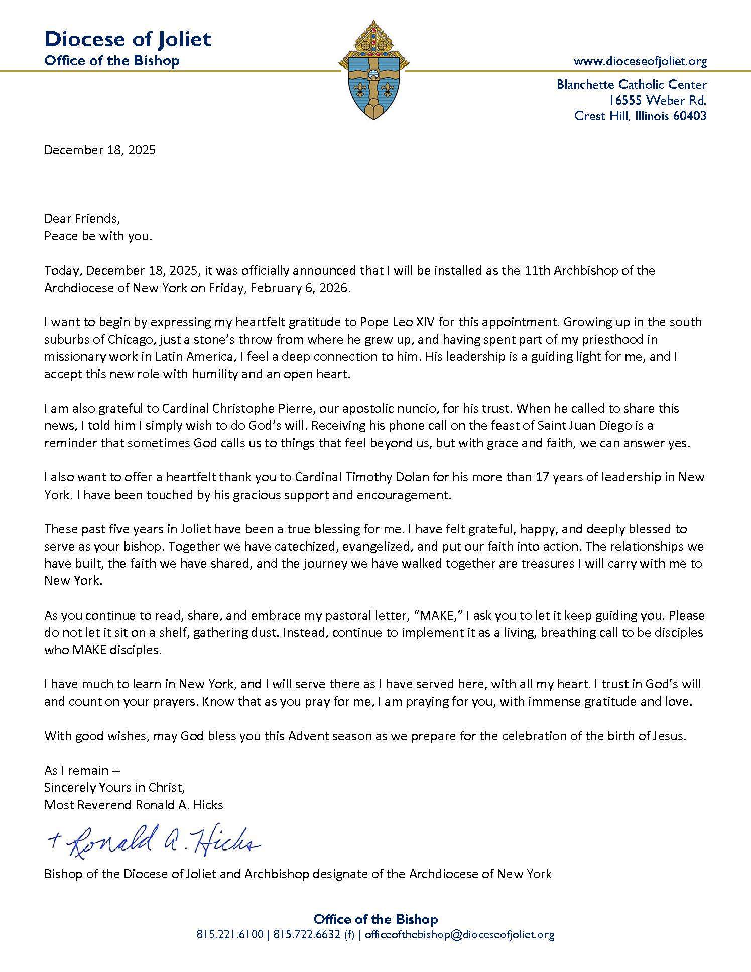 These past five years in Joliet have been a true blessing for me. I have felt grateful, happy, and deeply blessed to serve as your bishop. Together we have catechized, evangelized, and put our faith into action. The relationships we have built, the faith we have shared, and the journey we have walked together are treasures I will carry with me to New York.